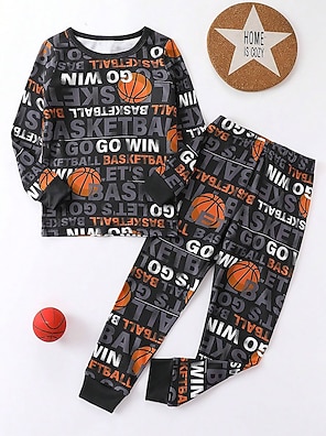 Boys 3D Letter Basketball Pajama Sets Long Sleeve 3D Print Fall Winter Active Cool Daily Kids 3-12 Years Crew Neck Home Causal Indoor Regular Fit