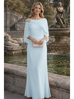 Corte A Vestidos Hasta el Suelo Vestido Invitada Boda Vestido formal Vestido de noche Vestido de Madrina Manga 3/4 Escote Barco Elegante Sencillo Minimalista Formal Gasa Chales con Fruncido Detalles