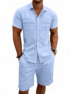 Hombre Camisa de lino 2 Piezas Conjunto de camisa Y Pantalón Corto Cargo Pantalón corto Pantalones cortos de lino Establecer Plano Diario Exterior Vacaciones Cuello Vuelto Manga Corta Verano Moda