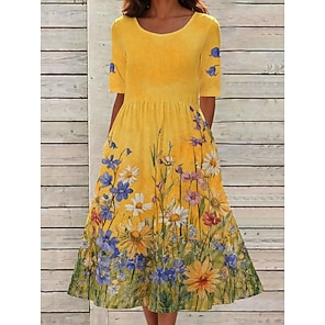 Mujer Vestido Midi Vestido de una línea Casual Diario Ajuste regular Floral Abstracto Manga Corta Escote en Pico Negro Blanco Marrón claro Naranja Verano Primavera