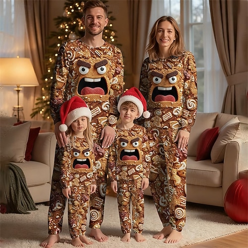 Perheen ilme joulu Joulun perheen pyjamat Yöpuvut Perhejoukot Kuvitettu Piparkakut miehet Koti Painettu Tumman ruskea Inkivääri Kameli Pitkähihainen Päivittäin Vastaavat asut #17498313