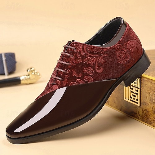 נעלי אוקספורד לגברים בצבע בורדו מובלטות עם ניגודיות דמוי עור חלקה ועקב נמוך, נעליים אלגנטיות ללבוש רשמי לעסקים, חתונות ואירועים #16108869