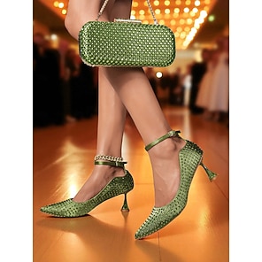 Női zöld strasszos magassarkú cipő és hozzá illő clutch táska szett - elegáns hegyes orrú, bokapántos cipők hivatalos eseményekre és koktélpartikra