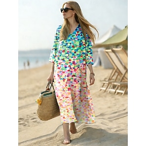 Women's Midi Dress Vászon Szerű Lélegző Könnyű Nyári Ruha Átmeneti Ruha A vonalú Ruha Nyaralás Casual Boho Strand Laza Illeszkedés Grafika Geometriai Hosszú Ujjú V Nyakú Kék Rózsaszín Lila Narancs