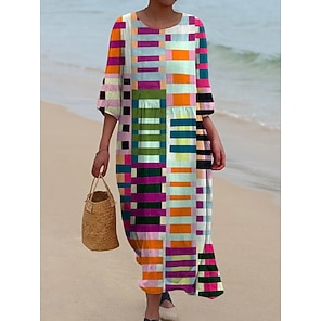 Women's Maxi Dress Vászon Szerű Lélegző Könnyű Kaftán 3/4 Hosszú Ujjú Kerek Nyak Casual Átmeneti Ruha Ruha Boho Napi Ünnepi Randi Grafika Geometriai Sárga Kék Szivárvány Tavasz Ősz