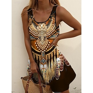 Női Boho Ruha Nyugati Ruha Vintage Mini Ruha A vonalú Ruha Off The Shoulder Ruha Nyaralási Party Lazac Party Kimenő Standard Fit Grafika Törzsi Ujjatlan U Nyak Sötétbarna Kék Zöld