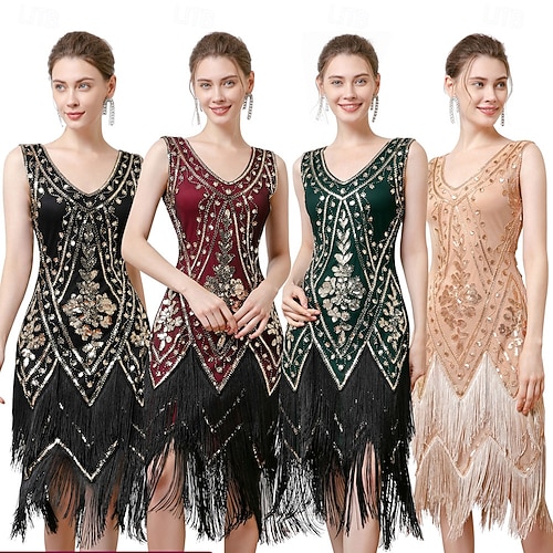 De livlige 20-årene 1920-tallet Knelengde Flapper kjole Ermeløs Den store Gatsby Paljetter Frynser V-hals Kostyme Dame Jul Karneval Maskerade Retro-temafest Charleston-dans Voksen Kjole #10938307