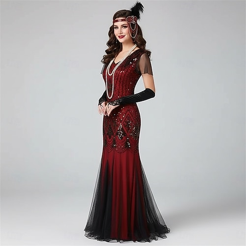 Sett De livlige 20-årene 1920-tallet Cocktail Kjole Ankellengde Kjoler Drakter Ballkjole med tilbehør Korte ermer Den store Gatsby Store størrelser Bryllupsgjest Dusk Dusk V-hals Kostyme Dame #13414809