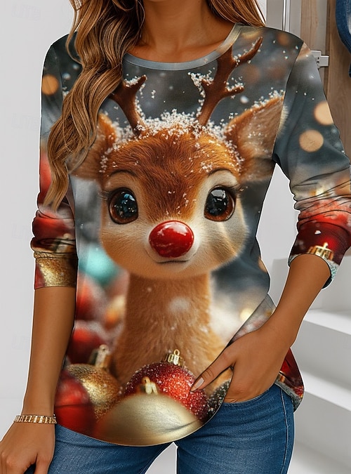 Julekvinnes T skjorte Claus Vintage Stilfull Klassisk Langermet Crew Neck Rund Hals Vanlige Topper Helg Trykk Salviegrønn Militærgrønn Kongeblå Blå Gull Vinter #15888808