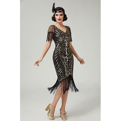 Retro / vintage De livlige 20-årene 1920-tallet Knelengde Flapper kjole Korte ermer Den store Gatsby Paljetter Frynser V-hals Kostyme Dame Jul Karneval Maskerade Retro-temafest Charleston-dans Voksne #10425531