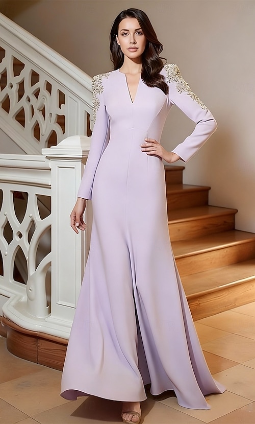 A-Line Sweep / Brush Train Evening Gown Elegant Sparkle Long Sleeve V Neck Wedding Formal with Rhinestone Pearls Shouder Flower #19800016