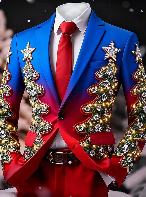 Christmas Men's Christmas Tree Blazer Jacket Comfortable Artistic Casual Party Evening Wear Daily Festival Buttons Print Spring Fall Winter Notch Long Sleeve Red 1 Red Blue #19428952
