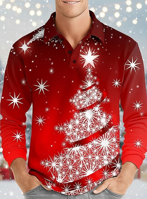 Christmas Men's Christmas Tree Polo Long Sleeve Polo Shirts Lapel Casual Outdoor Holiday Daily Wear 3D Print Buttons Spring Fall Winter Red Blue Purple #15233185