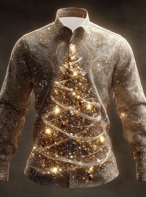 Christmas Men's Christmas Tree Sparkling Glitter Christmas Light Shirt Button Up Shirt Long Sleeve Funny Christmas Gifts Holiday Spring Fall Turndown 3D Print Collared Shirts Light Grey Beige Gray #18058666