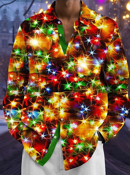 Christmas Men's Sparkling Glitter Christmas Light Shirt Button Up Shirt Long Sleeve Fashion Casual Holiday Spring Fall Turndown 3D Print Front One Pocket Linen Like Shirt Orange Green Rose Red #15609304