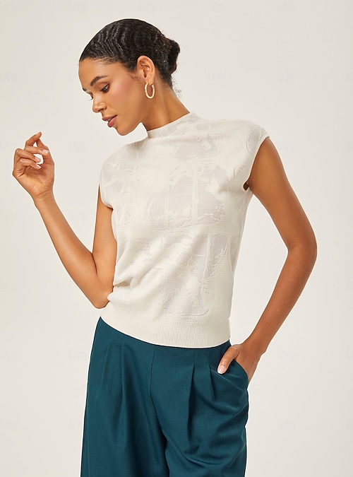 Ivory Wool Jacquard Mock Neck Knit Top #14654427