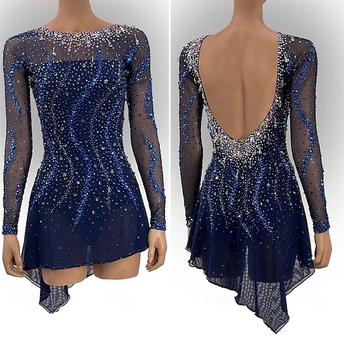 Figure Skating Dress Women's Girls' Ice Skating Dress Navy Thumbhole Open Back Mesh High Elasticity Training Competition Skating Wear Classic Crystal / Rhinestone Long Sleeve Ice Skating Figure #13787549