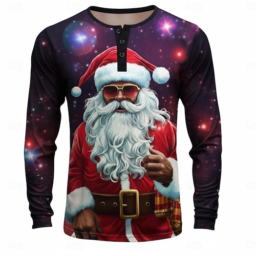 Men's Christmas Santa Claus Henley Shirt Long Sleeve Fashion Cute Daily Casual Holiday Going out Winter Spring & Fall Dark purple Henley Henley T-Shirt #13320459