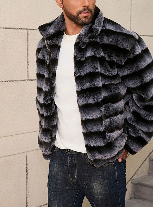 Men's Winter Jacket Faux Fur Coat Vacation Daily Thermal Warm Fleece Fall Winter Stripes Fashion Streetwear Stand Collar Regular Dark Gray Jacket #18210195