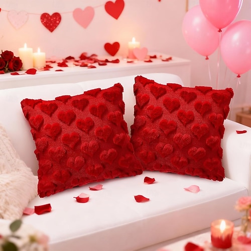 Valentines Day Decorations Pillow Covers - 18x18 inch Set of 2 Heart Shaped Pattern Faux Fur Soft Plush Throw Pillows Case for Indoor Outdoor Sofa Bedroom Living Room Festivals Anniversary Home Decor #19801704