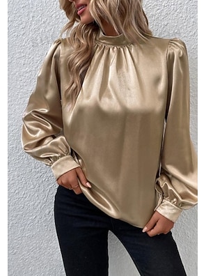 Women's Petite Tee Top Pleats Glossy Finish Solid Color Elegant Stylish Long Sleeve Mock Neck Regular Tops Daily Party Outfits Black and gray Spring Fall
