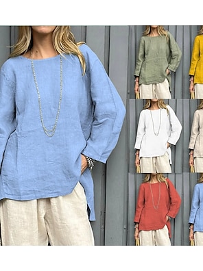 Femmes Chemisier 100% Coton Patchwork Couleur Unie ancien Occasionnel Boho manche longue Col rond Hauts Réguliers Quotidien Week-end Blanche Jaune Rouge Bleu Ciel Kaki Printemps, Automne, Hiver, Été