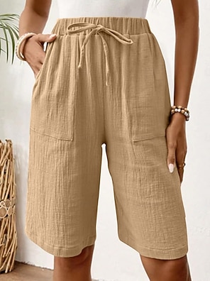 Shorts en Coton Lin pour Femmes Shorts de Plage Shorts Baggy Vacances Streetwear Longueur Genou Taille Haute Unie à Cordons Poche Ceinture Élastique Confort Quick Dry Doux Extensible Plage Vacances
