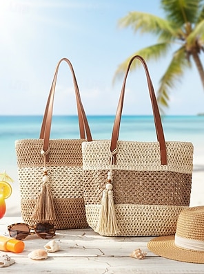 Women's Large Capacity Handmade Woven Straw Round Tote Bag - Bohemian Beach Tote with Tassels, Summer Vacation Rattan Wallet for Travel, Shopping and Vacation Brown Beige