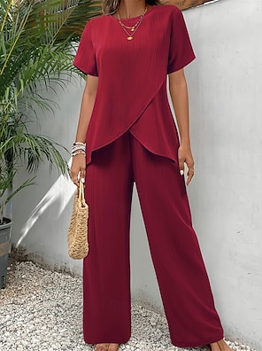 Women's T Shirt Pants Sets Bolero Top Short Sleeve Crew Neck Round Neck Solid Color Fashion Streetwear Daily Outdoor Vacation Red Navy Blue Green Summer Regular Fit Loose Fit