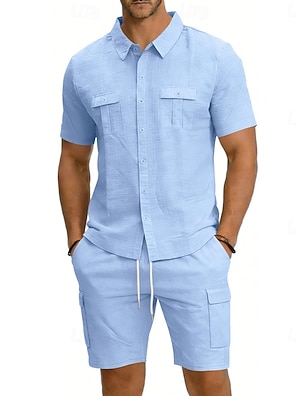 Men's 2 Piece Shirt Set Summer Set Matching Sets Casual Shirt Black White Gray Light Blue Short Sleeve Plain Standing Collar Vacation Daily Front Pocket Clothing Apparel Cotton Cotton Blend Fashion