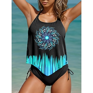 Dam Plusstorlekar Badkläder Tankini 2 st Längre baddräkt Baddräkt 2 st Sommar Blommig Axelband Ärmlös Baddräkter