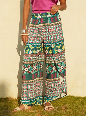 geometriskt blommönster i satin med vida ben, avslappnad semester