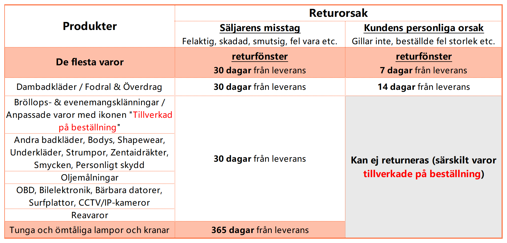 Med undantag för vissa specialbeställda, anpassade eller särskilda produkter enligt gällande lagar i ditt lokala land eller region, kan majoriteten av produkterna returneras. De specifika villkoren varierar dock beroende på anledningen till returen och produkttypen. Se tabellen nedan för detaljer.
