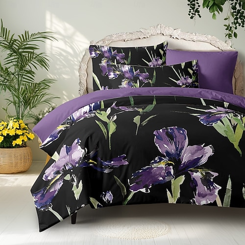 lila svart blommig serie påslakanset king queen size 3-delat set microfiber sängkläder perfekt för mors dag present supermjuk hudvänlig långvarig #19596704